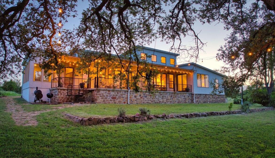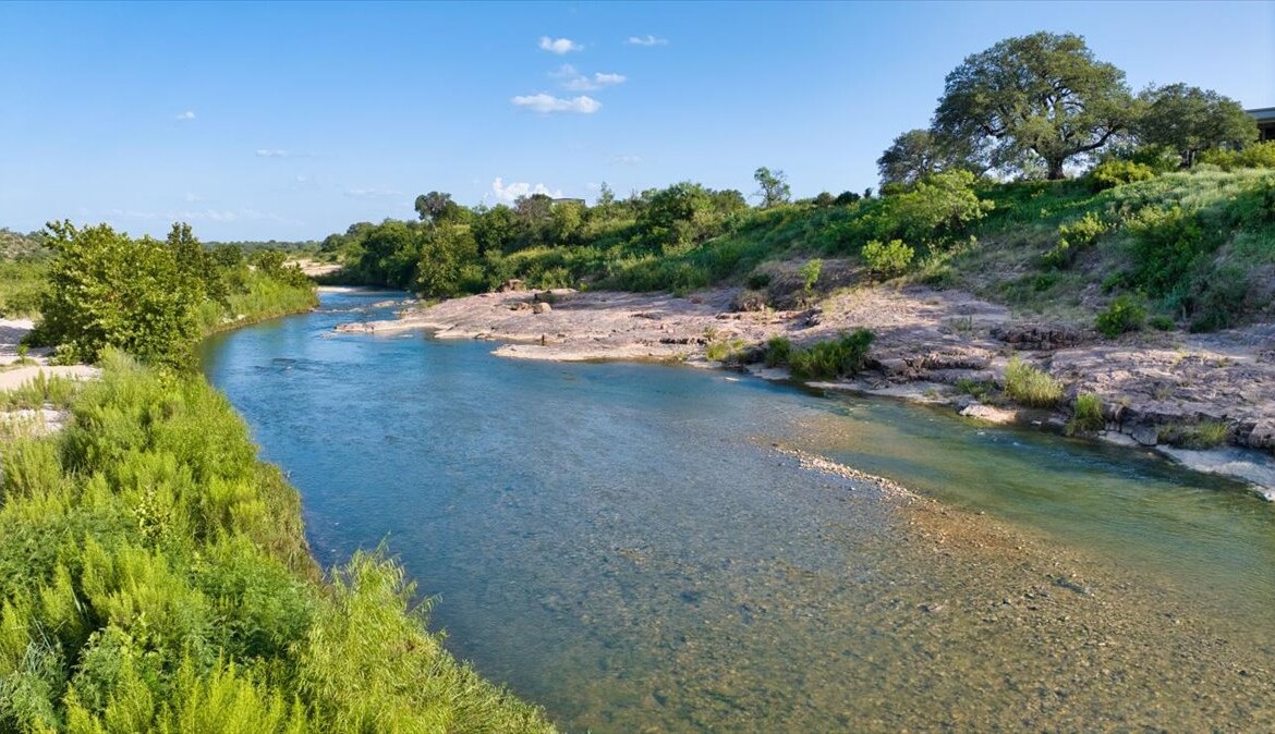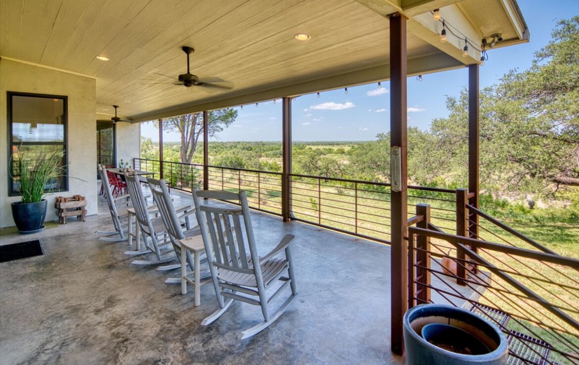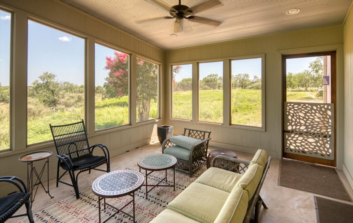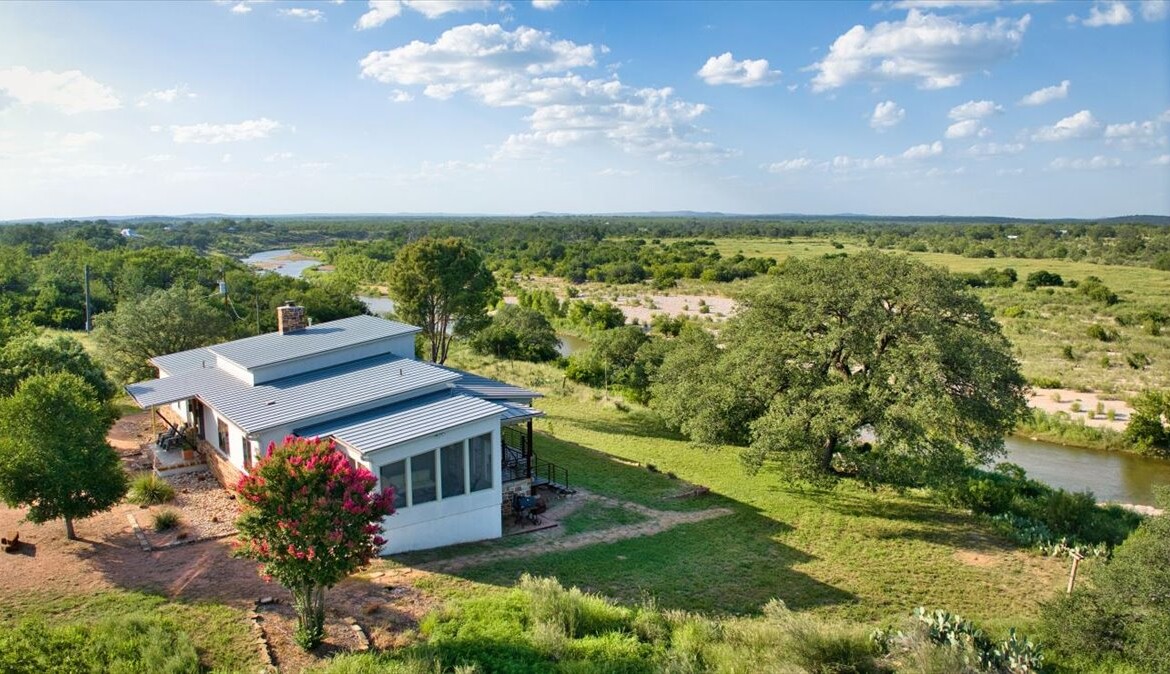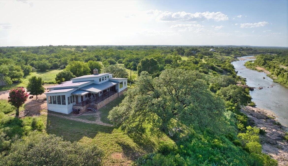 Wide, full-length porches—one screened for all-season enjoyment—invite you to take in the peaceful riverfront and the shade of a magnificent 300-year-old Live Oak. The home’s rock-and-stucco exterior and standing seam metal roof echo its timeless Hill Country roots.