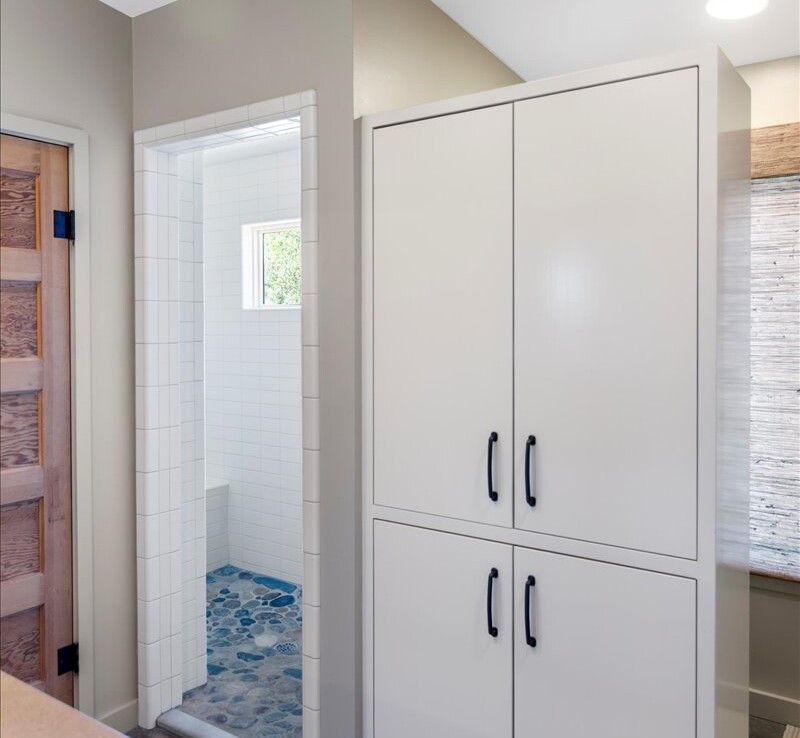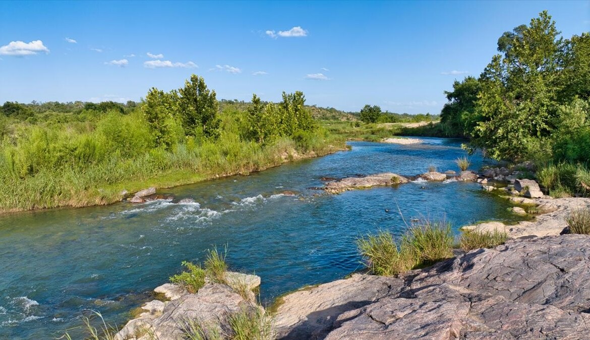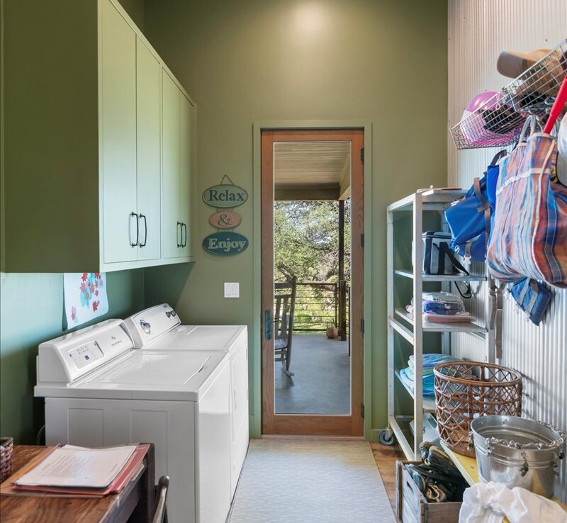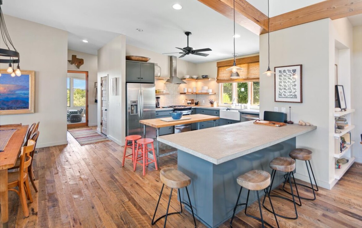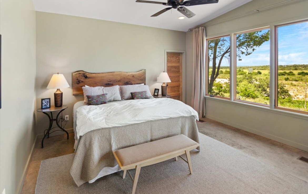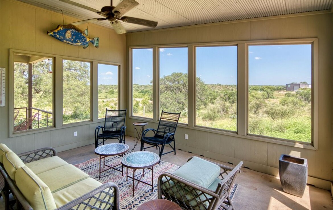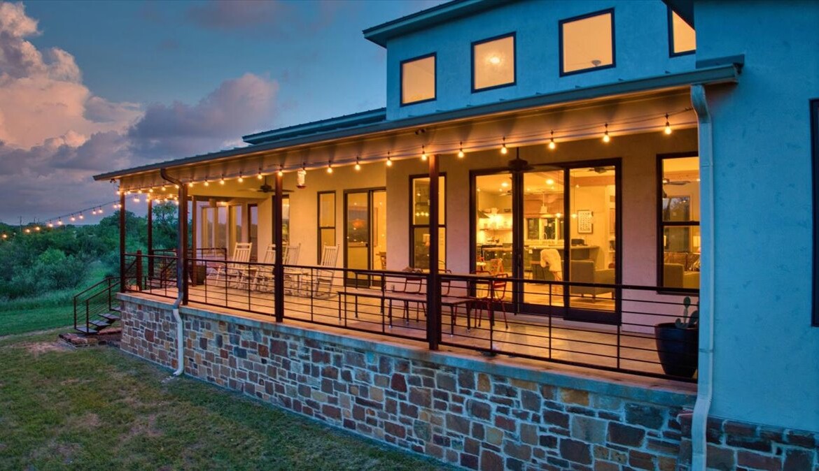 Wide, full-length porches—one screened for all-season enjoyment—invite you to take in the peaceful riverfront and the shade of a magnificent 300-year-old Live Oak. The home’s rock-and-stucco exterior and standing seam metal roof echo its timeless Hill Country roots.