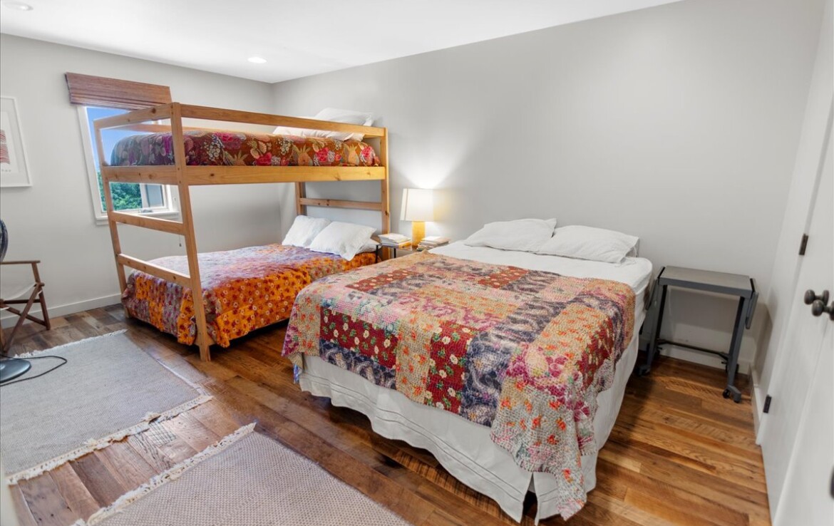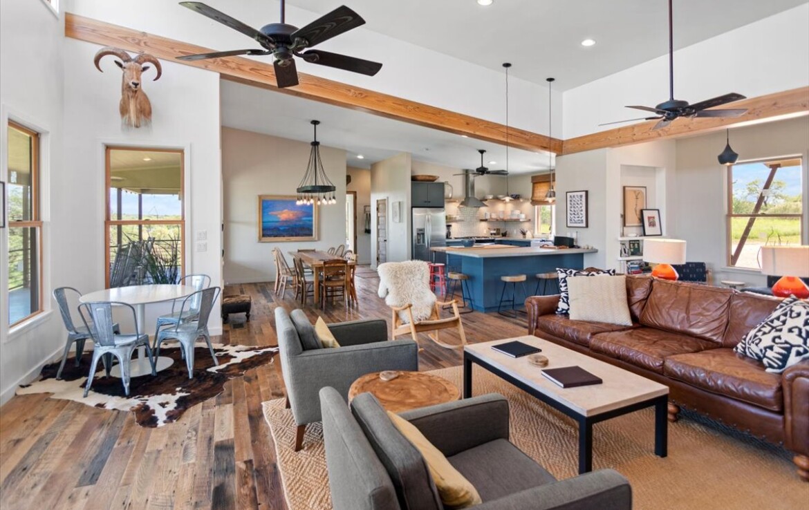 Set high on a bluff with panoramic river views, the thoughtfully designed interior—curated by Edgarton Studio’s Ann Edgarton and featured in Better Homes and Gardens (Nov. 2016)—welcomes you with warmth and character. Reclaimed barn wood floors run throughout the open-concept living, dining, and kitchen space, where a custom dining table fashioned from a vintage bowling alley sparks conversation and nostalgia. A stone gas fireplace anchors the room in rustic elegance.